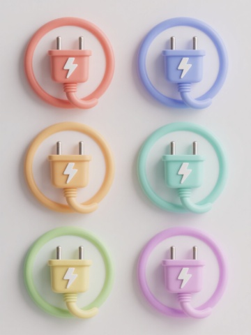 一套6张的系列按钮素材集合,纯白色背景,每张素材均为规整排布的单一造型图案,3D立体风格,光滑的塑料质感,带有渐变色彩和高光反射效果,图案为不同展现形式的闪电造型,颜色可多样化,包括但不限于蓝色、紫色、绿色、黄色、橙色、红色等,闪电的形状可有所变化,如不同的角度、分支数量或粗细,保持整体的统一性和系列感,图形居中放置,边缘清晰,无模糊效果,适合作为UI界面的按钮图标使用。