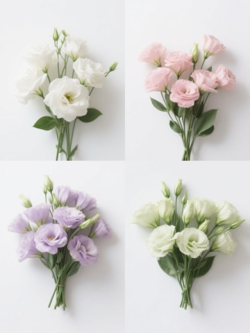 四张规整排布的现代简约风格花卉素材,每张素材均为不同种类的鲜花花簇,包含白色百合、粉色玫瑰、紫色飞燕草及绿色叶材等,花卉造型自然饱满,色彩清新雅致,层次丰富,细节清晰,整体置于纯净的白色纯色背景上,无任何文字、logo及水印,画面简洁干净,突出花卉主体的自然美感与设计感。