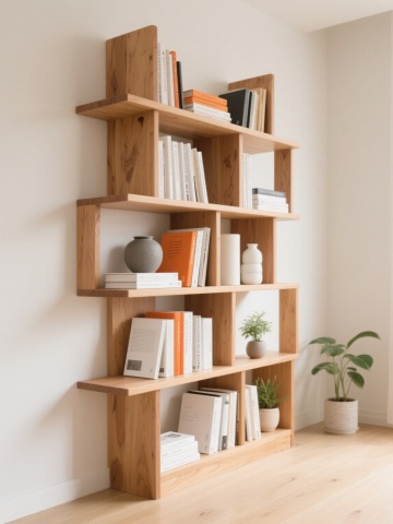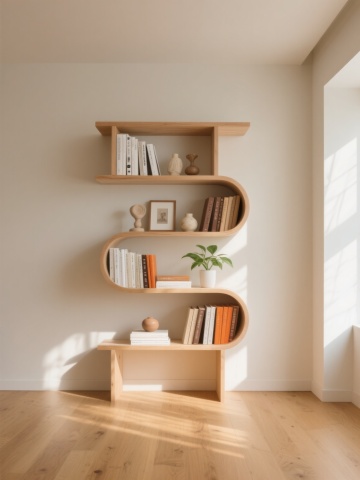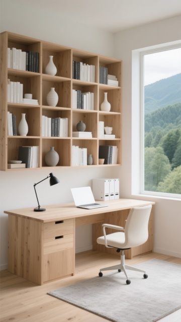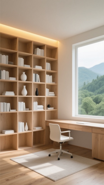 明亮通透的现代简约风格书房背景,浅米色木质书架占据整面墙,整齐排列着大量精装书籍、相框、陶瓷花瓶和小型绿植,书架前有一把浅木色扶手椅配浅色靠垫,旁边立着白色布艺落地灯,右侧有大型绿植置于白色花盆中,地面铺浅色木地板,中央放置浅灰色圆形地毯,左侧是大面积玻璃窗,白色窗帘半透,整体采用柔和自然光,色调以原木色、白色、浅灰色为主,营造出宁静、舒适、整洁的居家阅读氛围,空间感开阔,细节精致,具有北欧极简主义的设计感。