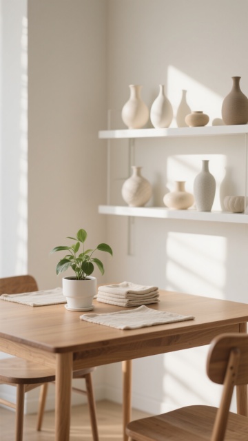 原木色桌面搭配浅色墙面的室内场景,柔和的自然光从左侧洒入形成斑驳光影,右侧白色开放式书架上摆放不同造型的陶瓷花瓶与装饰摆件,桌面上换为盛放绿色植物的白色花盆和叠放的浅色布艺餐垫,整体采用米色、浅灰与原木色调营造温馨简约的居家氛围,焦点清晰、背景虚化,呈现干净通透的生活美学感。