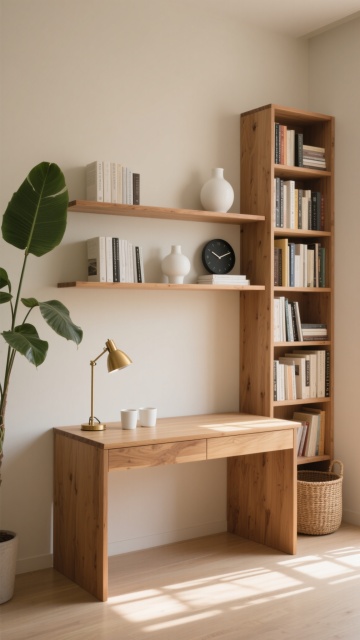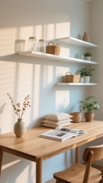 自然光摄影风格,柔和明亮的光线从侧上方洒入,在浅米色墙壁上形成清晰的光影条纹,温暖的木质桌面占据画面下方三分之一,桌面上摆放着不同的家居摆设,如插有干花的陶瓷花瓶、叠放的布艺靠垫和一本翻开的装饰画册,背景中是重新布置的白色开放式置物架,架上陈列着造型简约的玻璃罐、藤编收纳篮和绿植盆栽,整体色调采用原木色、浅灰色与淡蓝色的和谐搭配,营造出清新自然、整洁有序的现代简约家居氛围,焦点清晰,背景适当虚化,画面质感细腻,具有良好的空间层次感和舒适的居家温馨感。