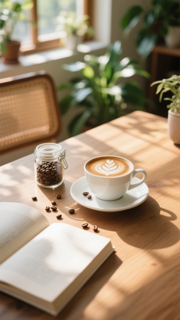 温馨明亮的室内场景,一张不同木纹配色的实木餐桌占据画面中心,桌面光洁平整,展现出自然的木材纹理和温润质感。窗外柔和的自然光透过百叶窗洒入,在桌面上形成斑驳的光影效果,营造出宁静舒适的氛围。餐桌周围摆放着不同的精致摆设,背景中是风格统一但细节不同的木质书架,书架上错落有致地摆放着书籍和装饰品,旁边立着一盏设计简约的台灯,整体构图采用近景聚焦桌面、背景略微虚化的方式,光影柔和,色彩和谐,充满生活气息与温馨感。