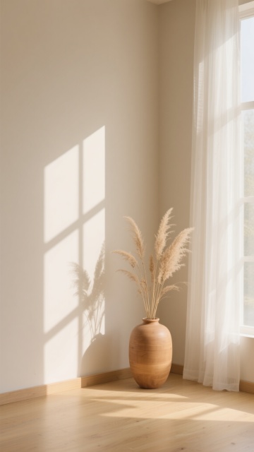 温暖柔和的自然光透过窗棂,在米白色的墙面上投下清晰而富有层次感的植物枝叶阴影,光影交织形成自然的渐变效果,整体画面呈现出朦胧而宁静的温馨氛围,色调以柔和的米白与浅棕为主,光线柔和不刺眼,营造出舒适惬意的居家感觉。