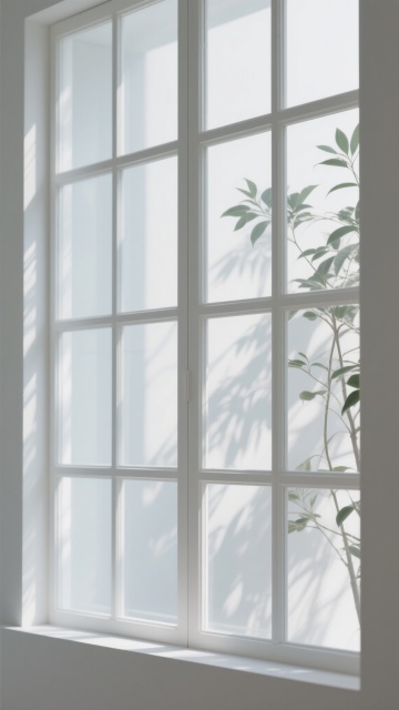 简约现代风格的窗户背景,白色窗框分割成多块玻璃,左侧玻璃上投射着清晰的植物枝叶阴影,光影柔和自然,整体画面干净整洁,呈现出宁静通透的氛围,适合作为简洁的室内背景。