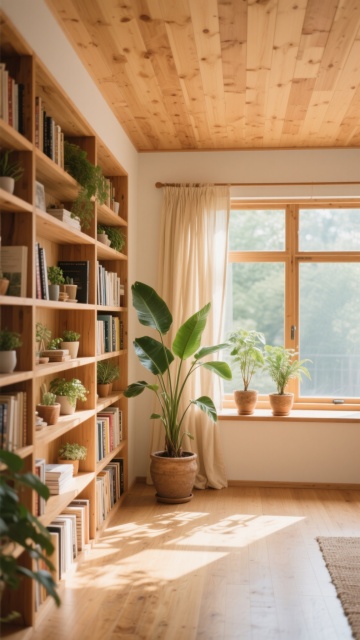 温暖明亮的书房背景,大面积的木质窗户透进柔和的阳光,形成明显的光束和光斑效果,木质书架上整齐排列着各种颜色的书籍,窗台和桌面上摆放着茂盛的绿色植物,叶片上有清晰的光影纹理,整体色调以原木色、绿色和暖黄色为主,光线柔和自然,营造出宁静、舒适、充满书香气息的氛围,细节丰富,具有写实的质感和细腻的光影过渡。