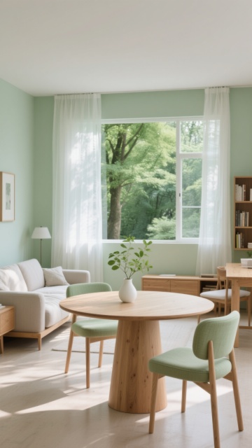 明亮通透的现代简约风格室内场景,柔和的浅绿色墙面搭配白色透光纱帘,窗外是郁郁葱葱的绿色树木,自然光透过纱帘形成柔和的漫射光影效果,木质圆形餐桌搭配浅绿色布艺餐椅,桌面摆放简约白色陶瓷花瓶,内插新鲜绿植枝叶,整体色调以原木色、浅绿色和白色为主,营造清新自然、宁静舒适的氛围,不同角度展示室内不同家具(如沙发、书架、床头柜、书桌等)与整体环境的和谐统一,保持相同的光线质感、色彩搭配和简约设计美学,确保画面具有高度的空间感和真实的材质表现。