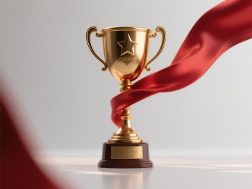 白色背景,奖杯都具有高度写实的3D质感,金属光泽细腻,高光和阴影过渡自然,其中一个金色奖杯带有飘逸的红色缎带,整体构图均衡,视觉层次分明,营造出庄重而荣耀的氛围。
