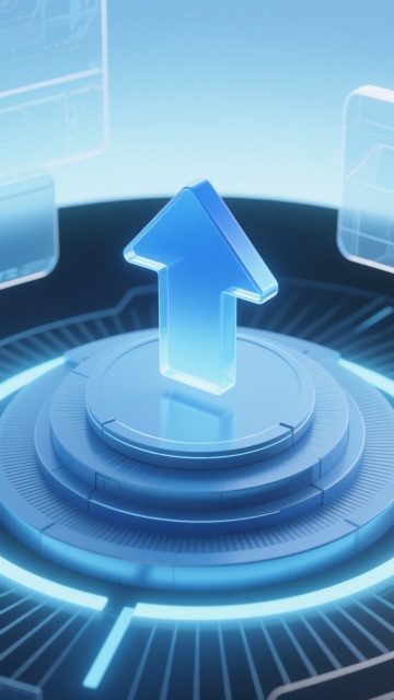 俯视图,城市环绕、科技感虚拟屏幕为背景,中心台阶上摆放着一个巨大的蓝色水晶赛事奖杯,奖杯复杂有设计感,玻璃水晶材质,奖杯中间镶嵌着一个发出蓝色光泽的四角星水晶,四角星多层嵌套,奖杯杯身形状敦厚,形状饱满,圆润。前景有两道脉冲光线顺延到奖杯,整体具科技氛围。色调为梦幻与科技混合的蓝色、白色、浅蓝色,有粒子光效与浅蓝色天空,天空闪烁星光,环境光凸显奖杯。整体画面,蓝色与白色高对比度。浅色背景,3D渲染氛围,高质感画面。荣誉感,构图对称,风格科幻