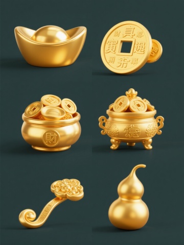 一组6个完全不同的金色传统财富元素的3D渲染集合,每个元素保持与金色元宝相同的高光泽金属质感、温暖金黄色调、光滑曲面和细腻反光效果,元素包括金锭、古钱币、聚宝盆、金币、金如意、金葫芦,均为纯色背景下的写实3D风格,整体采用规整的2x3网格排布,每个元素独立呈现且视觉风格高度统一,共同构成财富主题系列素材。