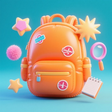 六个软3D风格卡通背包的系列素材集合,每个背包保持相同的造型设计:黄色主袋、粉色翻盖和前袋、蓝色背带和圆形按扣、侧边口袋及水滴装饰,均为纯色背景,规整排列。第一个背包采用橙色主袋搭配绿色翻盖和紫色背带,第二个为蓝色主袋配黄色翻盖和橙色背带,第三个是绿色主袋配蓝色翻盖和粉色背带,第四个为紫色主袋配橙色翻盖和绿色背带,第五个是粉色主袋配紫色翻盖和黄色背带,第六个为红色主袋配蓝色翻盖和绿色背带,所有背包边缘有深色描边,整体呈现可爱的卡通质感和统一的软3D风格。