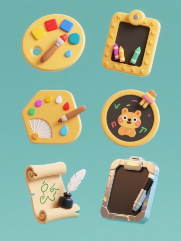 3D风格,6个不同配色、不同样式、不同材质的卡通趣味元素,每个元素都具有圆润可爱的造型,明亮鲜艳的色彩搭配,部分元素带有光滑的塑料质感和柔和的高光,整体呈现出活泼欢快的氛围,白色背景,元素排列整齐有序,构图均衡,视觉层级清晰,信息传达高效,符合儿童或年轻受众的审美,充满设计感。