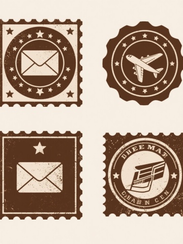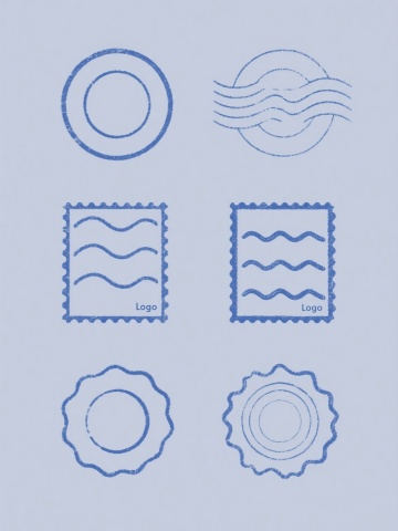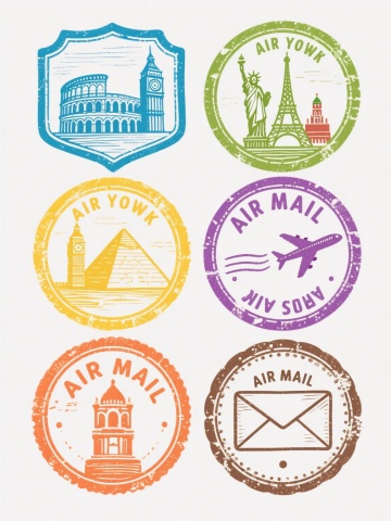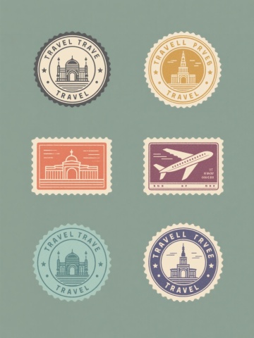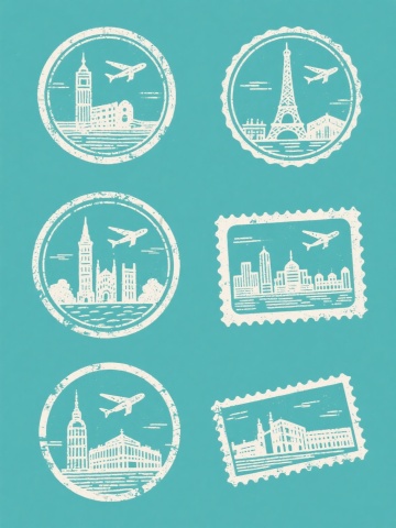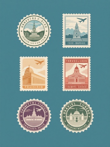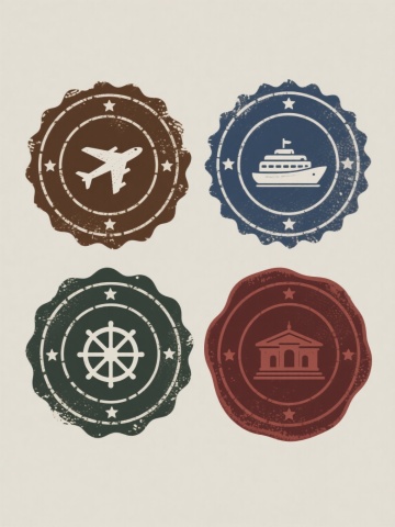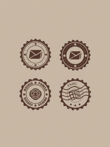 四个不同款式和颜色的邮戳规整排布在纯色背景上,保持简约现代的整体造型。每个邮戳都具有复古印章的质感,带有自然的磨损和斑驳效果,边缘呈现出不规则的压痕。邮戳内部包含不同的象征性图案,如飞机、轮船、星形、环形线条等装饰元素,颜色分别采用棕褐色、深蓝色、暗红色和墨绿色,均为沉稳的复古色调。整体设计无任何文字、logo和水印,画面干净整洁,视觉层次清晰,通过邮戳的大小统一和色彩变化形成和谐的视觉节奏,具有高效的信息传达效率和现代设计感。