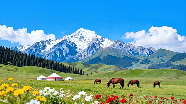 一幅高清晰摄影风格的风景海报,明亮通透的光线,湛蓝的天空飘着几朵白云,远方是巍峨壮丽的雪山,山顶覆盖着皑皑白雪,山体呈现出灰蓝色的岩石纹理,山脚下是连绵起伏的绿色丘陵和茂密的墨绿色云杉林,近处是广阔无垠的青翠草原,草原上点缀着白色和红色相间的蒙古包,几匹棕色的骏马正在悠闲地低头吃草,前景是色彩斑斓的野花丛,有黄色、白色和红色的花朵,整体构图采用由近及远的层次感,色彩鲜明和谐,营造出宁静、自然、辽阔的高原草原氛围,充满生机与壮美。详情
