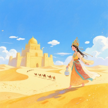 沙漠背景,以黄色和橙色为主色调,沙丘连绵起伏,远处有模糊的山脉轮廓,呈现出写意风格,营造出丝绸之路的悠远意境。