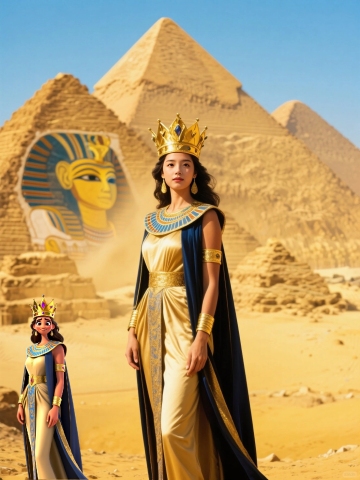 古埃及法老黄金头饰,部落羽毛披肩,沙漠中的全息金字塔,电影灯光