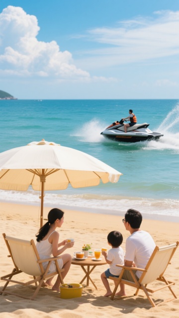 温馨明亮的阳光海滩场景,写实风格家庭摄影,柔和自然光线从侧面洒落,营造温暖宁静氛围。年轻母亲穿着浅蓝色无袖上衣和米色长裤,面带温柔微笑,闭着双眼,将穿着白色条纹连体衣的熟睡婴儿轻柔环抱在怀中,婴儿头部依偎在母亲肩头,四肢放松。背景为金色沙滩、清澈海水和蔚蓝天空,远处有白色帆船,近处散落着米色遮阳伞和编织沙滩椅,整体色调以柔和的蓝、白、米色为主,画面构图采用三分法,突出母子间亲密温馨的互动,光影过渡自然,细节清晰,传递出宁静幸福的家庭情感。