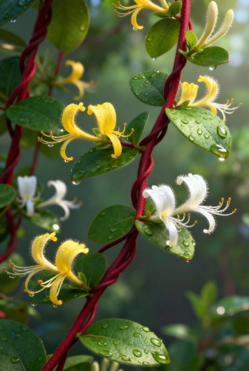 写实风格摄影,不同场景下的金银花背景,画面以金银花藤蔓为主体,白色和淡黄色的花朵优雅绽放,细长的花蕊自然舒展,深绿色的卵形叶片饱满有光泽,表面带有晶莹的水珠,藤蔓呈红褐色,整体构图遵循三分法,背景为虚化的绿色植物营造自然景深,光线柔和明亮,呈现出清新、生机盎然的氛围,色彩真实自然,细节清晰,突出金银花的自然美感与植物纹理。