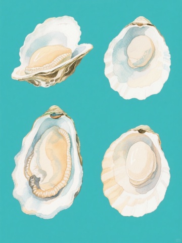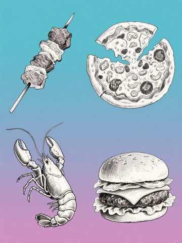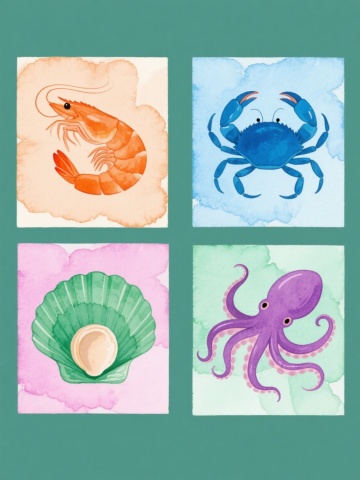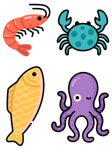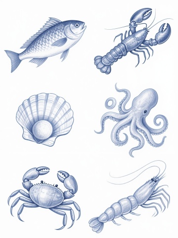 四个规整排布的手绘线稿风格海鲜插画集合,保持原图黑白简约的钢笔线条质感、细腻的纹理刻画和写实的形态特征,画面整体色彩变换为蓝灰色调,每个元素为不同的海鲜类目,分别是螃蟹、贝类、章鱼和鱼类,均以纯色背景衬托,元素大小统一且间距均匀,形成系列感强的素材集合,无文字和标识。