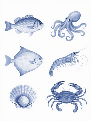 Set of 6 distinct seafood illustrations in detailed blue line art style on pure white background, featuring meticulously hand-drawn crustaceans and fish with precise cross-hatching and stippling techniques, including: 1) Side-facing mackerel with textured scales and fin details, 2) Detailed sea scallop with visible shell ridges and inner muscle, 3) Lateral view of spiny lobster with segmented antennae, 4) Swimming shrimp in mid-motion with curved abdomen, 5) Octopus with coiled tentacles and suckers, 6) Dungeness crab with extended pincers, arranged in clean 2x3 grid layout with consistent spacing, maintaining scientific illustration precision and vintage engraving aesthetic, no text or logos, isolated elements with fine line weights and organic texture rendering.