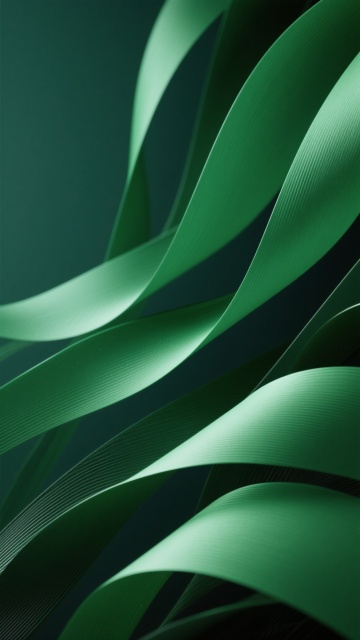 深绿色为主色调的抽象背景,画面中充满了流畅飘逸的波浪形线条,线条呈现出由深到浅的绿色渐变效果,部分线条边缘有明亮的高光勾勒,整体风格简约现代,具有强烈的动感和层次感,营造出宁静而富有生机的氛围。