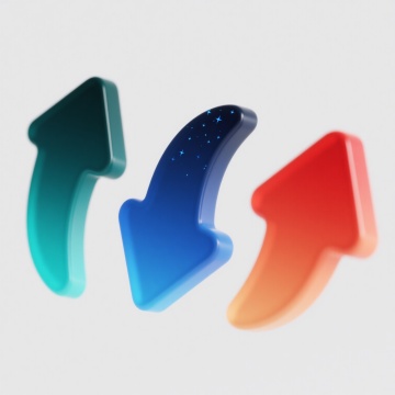 一套6个同系列上升箭头元素的集合,每个箭头均采用3D立体渐变效果,拥有光滑的曲面和鲜明的边缘高光,呈现出流线型的弯曲向上姿态,保持统一的简洁现代设计风格。每个箭头具有不同的纯色背景(如蓝色、绿色、紫色、红色、黄色、灰色等),并在箭头的具体造型细节(如弯曲弧度、箭头角度、整体比例)上有细微变化,整体规整地排列在白色背景上,形成协调且富有变化的视觉系列。