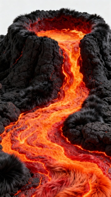 深邃纯黑背景上,流动的熔岩以动态的红色与橙色火焰形态呈现,岩浆在右下角形成向上延伸的炽热漩涡,表面有明亮的橙黄色高光和暗红色阴影,周围散布着细小的红色火星粒子,整体营造出神秘而炽热的宇宙火山喷发氛围,展现火星表面不同形态的熔岩流与火山活动景观,具有强烈的视觉冲击力和流动的液态金属质感。