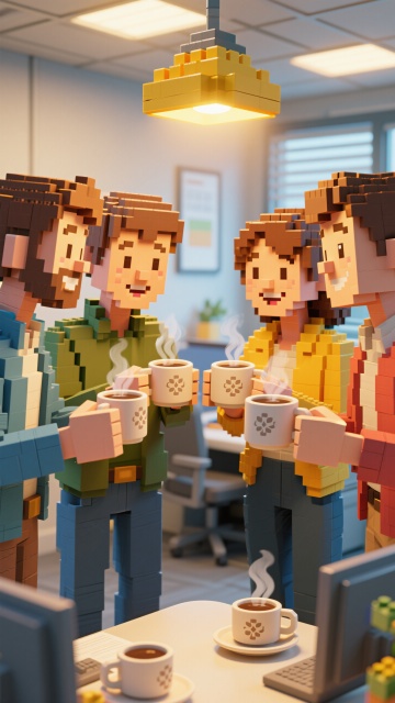 清新软3D风,卡通人物在现代办公室互动,色彩柔和,氛围轻松愉快。