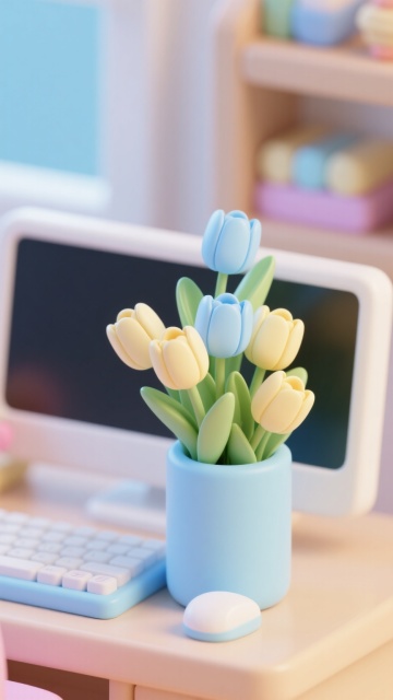 清新软3D风设计,桌面花瓶与电脑相映成趣,营造温馨办公氛围。