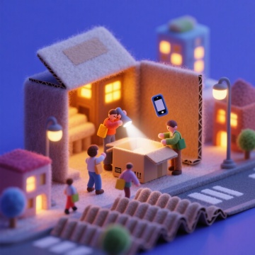 毛绒质感的微缩城市夜景,3D卡通人物在纸箱屋前搬运包裹,暖光与梦幻蓝调交织,充满温馨趣味感。