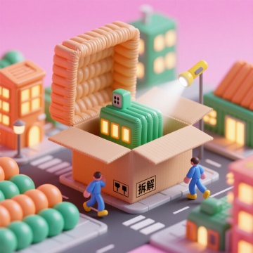 软3D风格微缩城市,充气质感建筑从纸箱中“拆解”而出,搭配卡通人物与梦幻灯光,营造趣味十足的可爱场景。