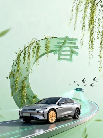 低角度仰拍,一辆银灰色哑光漆面的电动轿跑概念车以45度角斜停在云雾缭绕的悬崖公路边缘,悬浮式车顶与流畅的车身线条在晨雾中勾勒出未来感轮廓,22英寸涡轮扇叶轮毂边缘泛着冷光,车头贯穿式LED灯带正以呼吸频率缓缓闪烁。背景是被初升朝阳染成粉金色的雪山群峰,山腰间缠绕着乳白色的云海,几棵墨绿色松树枝桠从画面右下角斜伸而出形成自然框架。路面湿润泛着光泽,倒映着车身的金属质感,空气中漂浮着细密的冰晶微粒,在阳光照射下形成微型彩虹。汽车左侧后视镜上停着一只蓝色小鸟,与冷峻的科技感形成微妙对比。色调采用蒂芙尼蓝与深空灰的高级撞色,高光处泛着珍珠母贝光泽,阴影部分融入紫罗兰色过渡,整体构图遵循黄金螺旋,车辆位于螺旋中心偏右位置,背景雪山呈放射状向天际线延伸,营造出科技与自然共生的史诗感。