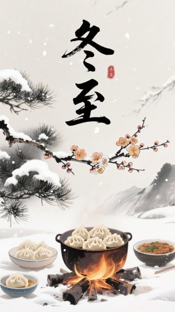 水墨风与工笔风交融,松梅映雪,暖火煮饺,大字“冬至”点题,传递中式古典温馨之美。