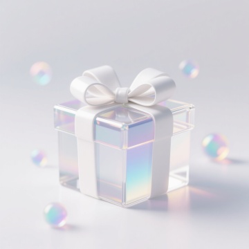 一个具有光滑白色造型的立体礼物盒,表面有透明渐变的玻璃质感,搭配一个大而精致的白色蝴蝶结,蝴蝶结边缘有柔和的光泽,礼物盒周围飘散着几个半透明的彩色光斑,整体采用明亮柔和的光影效果,背景为纯净的白色,营造出梦幻、轻盈、节日般的氛围。