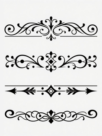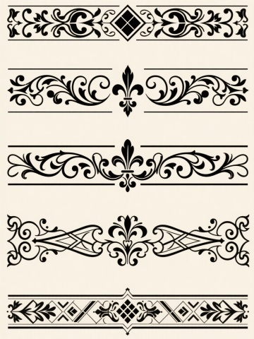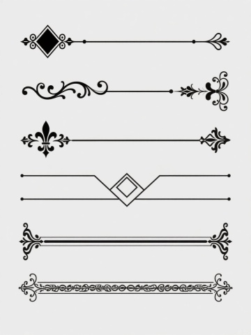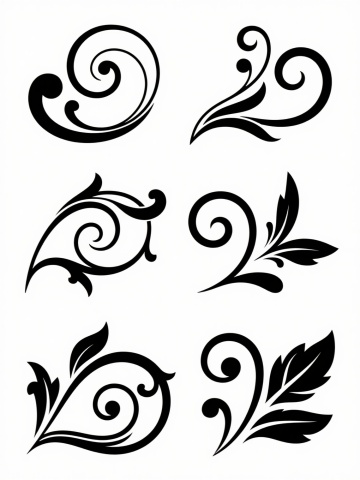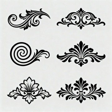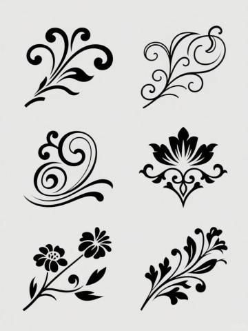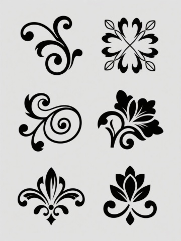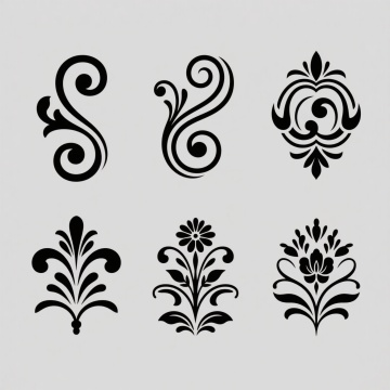 简约现代风格设计,浅灰色纯色背景,六个规整排布的欧式花纹素材,每个花纹均为黑色矢量线条构成,包含不同样式的卷曲藤蔓、涡旋图案、花卉装饰及对称纹样,整体造型简洁优雅,无文字、无logo、无水印,保持清晰的视觉层次和统一的设计感。