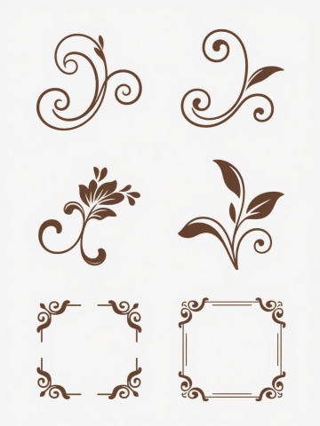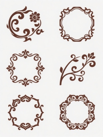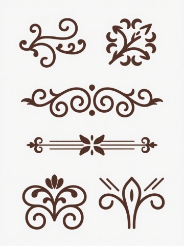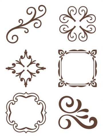 六个完全不同样式的国风花边元素,以规律的三行三列网格排列在纯白色背景上,每个花边均为深棕色,采用流畅的曲线线条构成,包含卷草纹、花卉纹、藤蔓纹等传统中式装饰元素,造型典雅,细节精致,整体呈现出古典雅致的设计感,无任何文字或二维码。