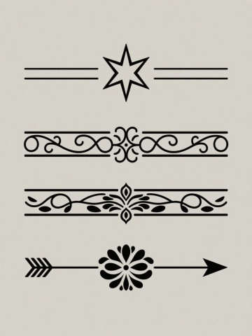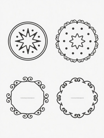 极简黑白线条艺术风格,纯色背景,系列素材集合规整排布,四个完全不同元素内容的圆形装饰边框设计,每个边框均包含对称分布的放射状星形图案、点缀其间的小圆点、角落装饰性卷曲花纹以及底部中央的文字区域,整体保持统一的几何对称美感和精致的线条细节,变换画面整体色彩,维持相同的视觉层级和设计感。