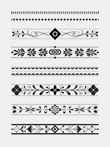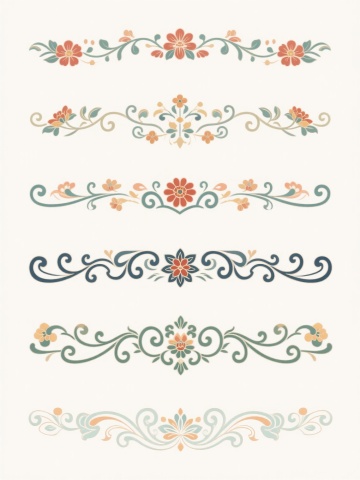 六个不同配色、完全不同样式的国风花边元素,以规律的垂直排列方式分布在纯白色的浅色背景上,每个花边均由传统中国风的花卉、卷草纹等图案构成,线条简洁流畅,图案精致对称,色彩鲜明且互不相同,整体呈现出典雅、古朴的东方美学韵味,适合作为装饰性纹样使用。