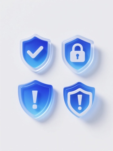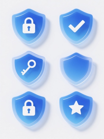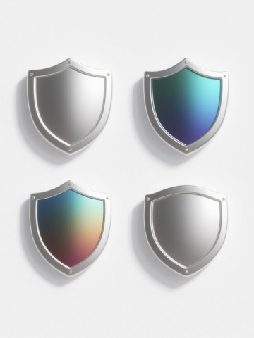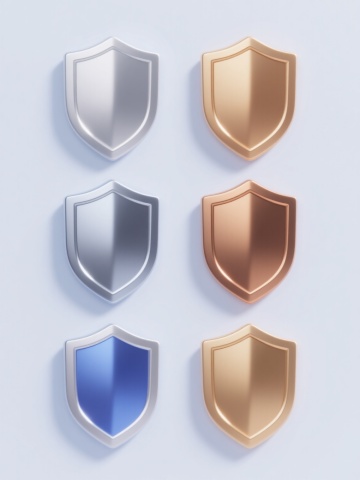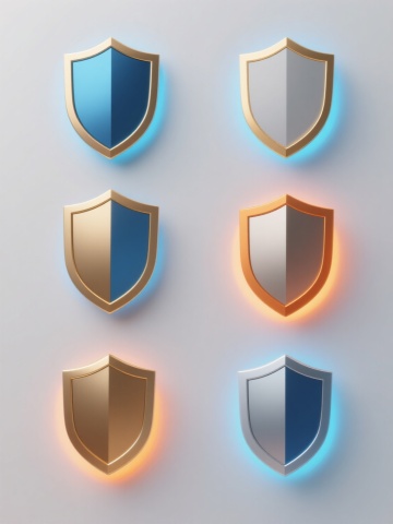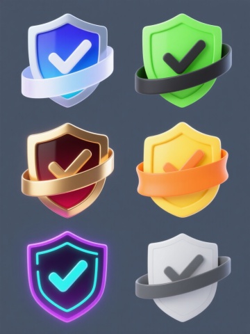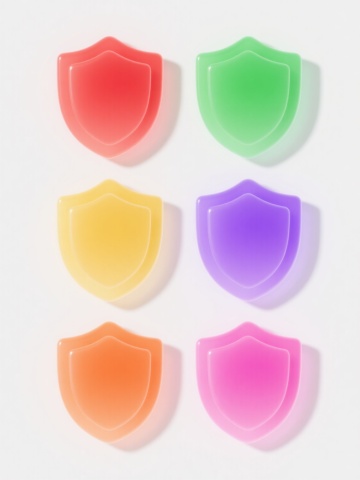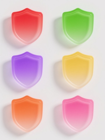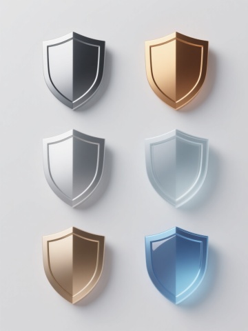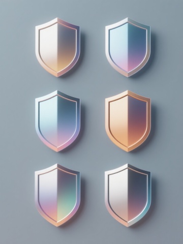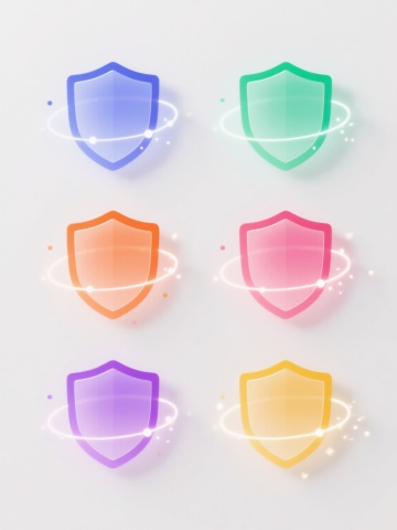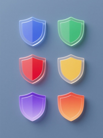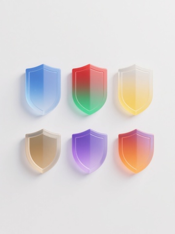 6个简约现代风格的护盾元素图标规整排布,每个护盾造型独特,采用不同配色方案(如蓝色、红色、绿色、黄色、紫色、橙色等)和各异材质表现(如光滑玻璃质感、磨砂金属质感、半透明塑料质感、哑光陶瓷质感、高光漆面质感、渐变果冻质感),整体设计简洁流畅,纯色背景,无任何文字、logo及水印。
