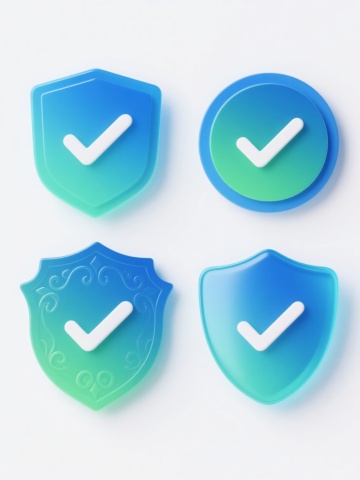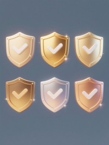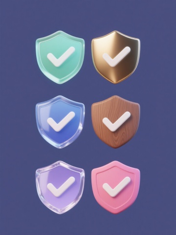 系列盾牌图标集合,保持原盾牌造型及中央白色对勾符号,采用纯色背景,画面整体色彩变换,6个盾牌分别呈现完全不同材质:磨砂玻璃质感(浅绿色)、抛光金属质感(深金色)、哑光陶瓷质感(天蓝色)、木质纹理质感(棕褐色)、透明水晶质感(淡紫色)、柔软硅胶质感(粉红色),所有盾牌元素造型一致,规整排列成系列素材集合,每个盾牌均保留原有的立体感和光泽表现,整体构图平衡对称。