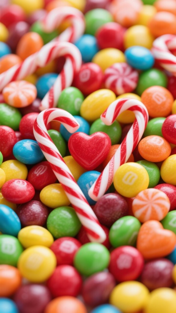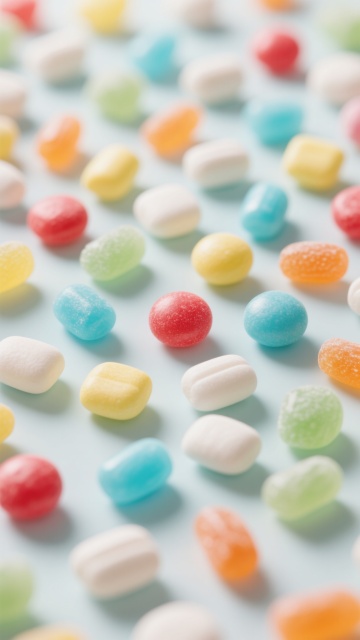 俯拍干净风格超写实糖果特写,明亮红黄蓝粉为主色调,螺旋棒棒糖、心形硬糖等丰富糖果从中心向四周散开,浅景深显前景清晰背景柔化,上方柔光洒下现高光阴影,突出糖果质感,细节满溢甜蜜童趣。