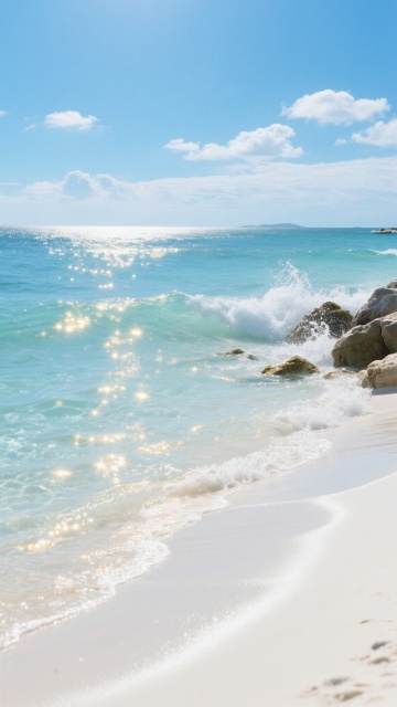 清澈透明的海水环绕着光滑的白色沙滩,阳光洒在海面上闪烁着金色的光芒,远处是蔚蓝的天空和几朵悠闲的白云,海浪轻轻拍打着岸边的礁石,溅起晶莹的水花,整体呈现出明亮、清新、宁静的夏日海洋氛围,具有高清晰度的写实质感和柔和的光影效果。