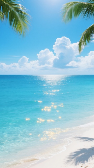超写实摄影风格,明亮通透的夏日氛围,纯净的渐变蓝色天空点缀着蓬松的白色积云,波光粼粼的广阔海面呈现从浅蓝到深蓝的自然过渡,海水清澈见底,可见细密的水波荡漾,阳光在水面洒下耀眼的金色光斑,画面右下角可见部分细腻柔软的白色沙滩,沙滩上有清晰的棕榈叶阴影,左上角和右上角各有几片翠绿的棕榈叶自然垂落形成边框,整体构图开阔舒展,色彩清新明快,光影对比强烈,营造出宁静惬意的热带海滨景象。