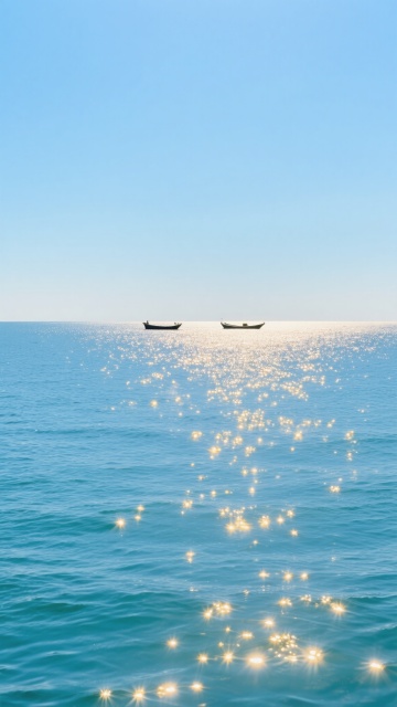晴朗无云的淡蓝色天空下,波光粼粼的广阔海面,阳光照射在海面上形成无数闪烁的金色光点,远处水平线上有两艘静止的小船,海水呈现出由近及远逐渐加深的蔚蓝到靛蓝的渐变色调,海面微波荡漾,整体画面营造出宁静、开阔、明亮的氛围,具有高度清晰的摄影质感和自然光线效果。