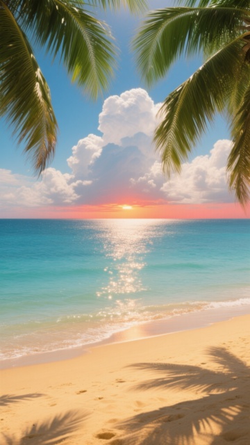 高清写实风格的海滩风景,视角为从沙滩斜向上仰望,画面上方两侧垂落着翠绿的椰子树叶形成自然边框,近处是细腻柔软的金黄色沙滩,海水呈现由浅至深的渐变蓝,从清澈的浅滩过渡到深邃的海洋,海天相接处漂浮着大片洁白蓬松的积云,光影改为日落时分的暖色调,夕阳的金红色光芒洒在海面上形成粼粼波光,沙滩上投下长长的棕榈树影子,整体氛围温暖宁静,充满热带度假风情。