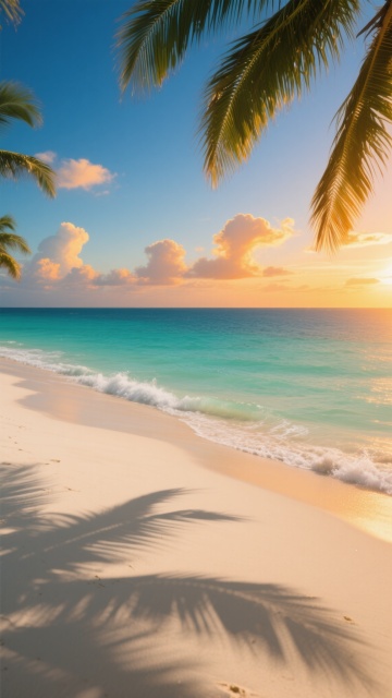 阳光明媚的热带海滩,从沙滩向海面延伸的低角度透视,温暖的夕阳余晖洒在米白色沙滩上,形成长长的棕榈叶阴影,远处是渐变的深蓝色海天相接,近处海水呈现清澈的绿松石色,细小的浪花轻轻拍打着 shoreline,天空中点缀着几朵金色边缘的云彩,温暖的橙色和黄色阳光与冷色调的海水形成鲜明对比,营造出宁静而浪漫的黄昏氛围,画面边缘有几片低垂的棕榈叶,增加了层次感和热带风情。