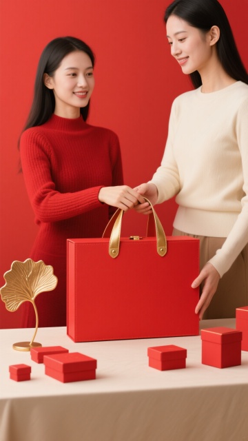 高饱和度纯红色背景,明亮柔和的顶光照射,营造出喜庆、温馨、简约高级的氛围。画面主体为两只手正在进行礼物交接:左侧人物穿着红色针织长袖衫,右手握住一个大红色方形礼盒的左侧底部;右侧人物穿着米白色针织长袖衫,双手分别捏住礼盒顶部的金色细长提手,正将其递出。礼盒表面光滑无图案,质感厚实。前景桌面上,右侧叠放着两个稍小的红色方形礼盒,左侧摆放着一个金色金属材质的扇形装饰品。整体构图简洁对称,色彩统一为大面积红色与少量金色点缀,具有清晰的视觉层级和现代简约的设计感,突出礼物赠送的温馨瞬间。