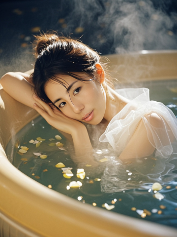梦幻浪漫的浴缸场景,柔和光影与花瓣交织,营造出舒适唯美的油画风氛围。