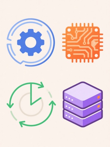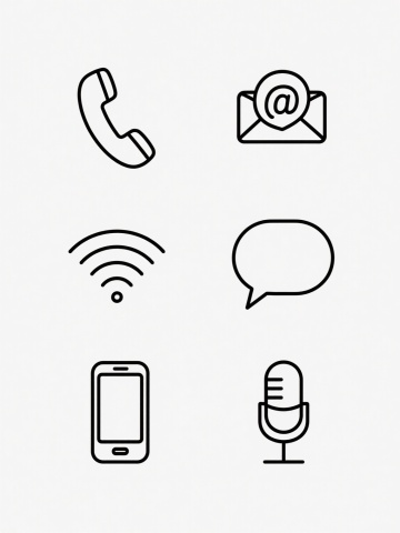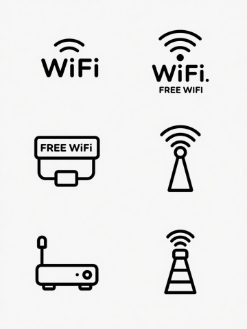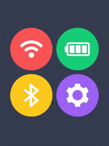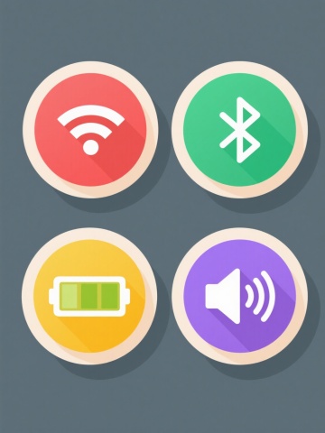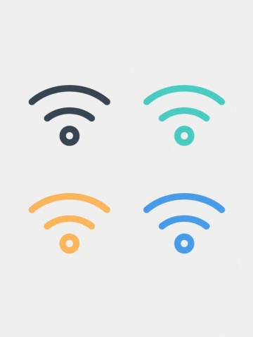 一套四个不同元素内容的系列素材集合,每个元素均采用简约扁平风格设计,线条圆润流畅,色块分明无渐变,配以轻微阴影增强立体感,背景为纯色(每个元素可使用不同的柔和纯色背景以区分),元素周围点缀少量黄色小星星和浅蓝色波浪线条作为统一装饰;四个元素规整排布于同一画面,呈2x2网格布局,彼此间距均匀,整体构图平衡对称。第一个元素为蓝色卫星天线,底座为深蓝色,支架为浅蓝色,碟形天线呈半透明浅蓝色,周围有信号波纹;第二个元素为绿色Wi-Fi路由器,主体为浅绿色长方体,顶部有三根白色天线,正面有若干小圆点指示灯,周围有Wi-Fi信号波纹;第三个元素为橙色智能手机,屏幕为深蓝色,机身侧面有按键,顶部有信号图标和电池图标,屏幕上可显示简单的信号格图案;第四个元素为紫色蓝牙耳机,左右耳机通过弧线连接,耳机外壳有圆形触控区域,耳机下方有充电盒,充电盒上有指示灯,周围有蓝牙连接符号。所有元素下方均无文字,保持视觉简洁统一。