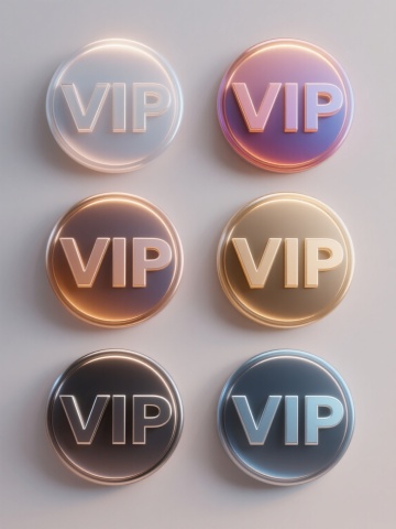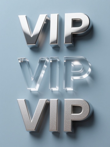 纯色背景上,三个相同造型的“VIP”立体字母组合以规整网格排布形成系列素材集合,每个字母组合保持原有的立体结构和轮廓特征但变换为完全不同的材质质感:第一个为高反光金属材质,表面有清晰的镜面反射和高光点;第二个为透明玻璃材质,具有通透感和轻微的折射效果,边缘有柔和的光晕;第三个为哑光金属材质,表面柔和无强烈反光,带有细微的磨砂颗粒感,整体画面色彩变换为统一协调的新色调,保持简洁现代的设计感和清晰的视觉层级,3D渲染,光线柔和,高清细节,极简风格。