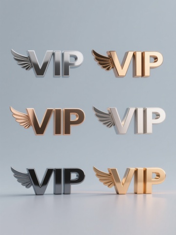 一系列6个不同配色、不同样式、不同材质的「VIP」造型,规整排布,整体造型简约现代,每个VIP标志均带有对称的翅膀设计,采用立体金属质感,高光与阴影过渡自然,具有强烈的光泽感和反光效果,纯色背景,无任何文字、logo和水印。